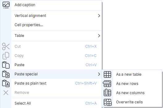 To paste copied cells, press Ctrl+V or right-click inside the table and select Paste from the context menu. You can also use the Paste special option from the context menu.