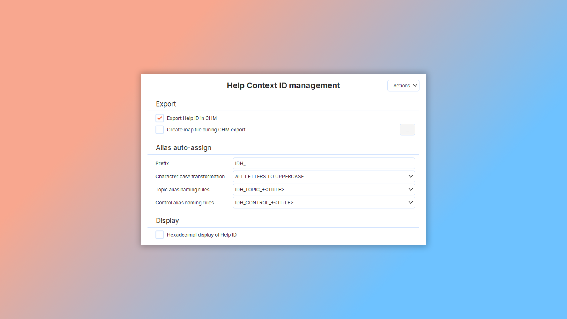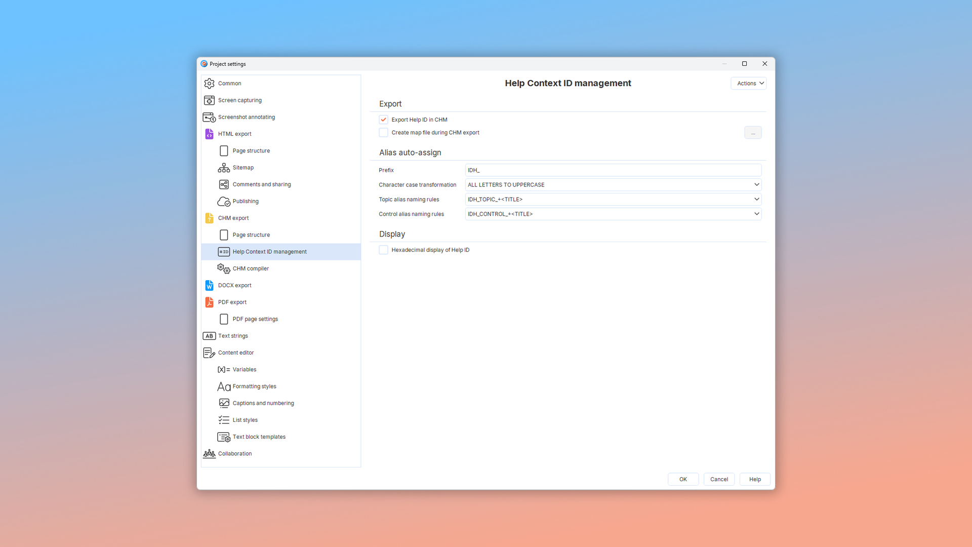 Dr.Explain lets you assign numeric Help Context IDs and text aliases to each topic, creating a fully context-sensitive help system for your application. If you already have a help project without these IDs, Dr.Explain can automatically assign them to all your topics — just define a simple naming rule, and the tool does the rest.