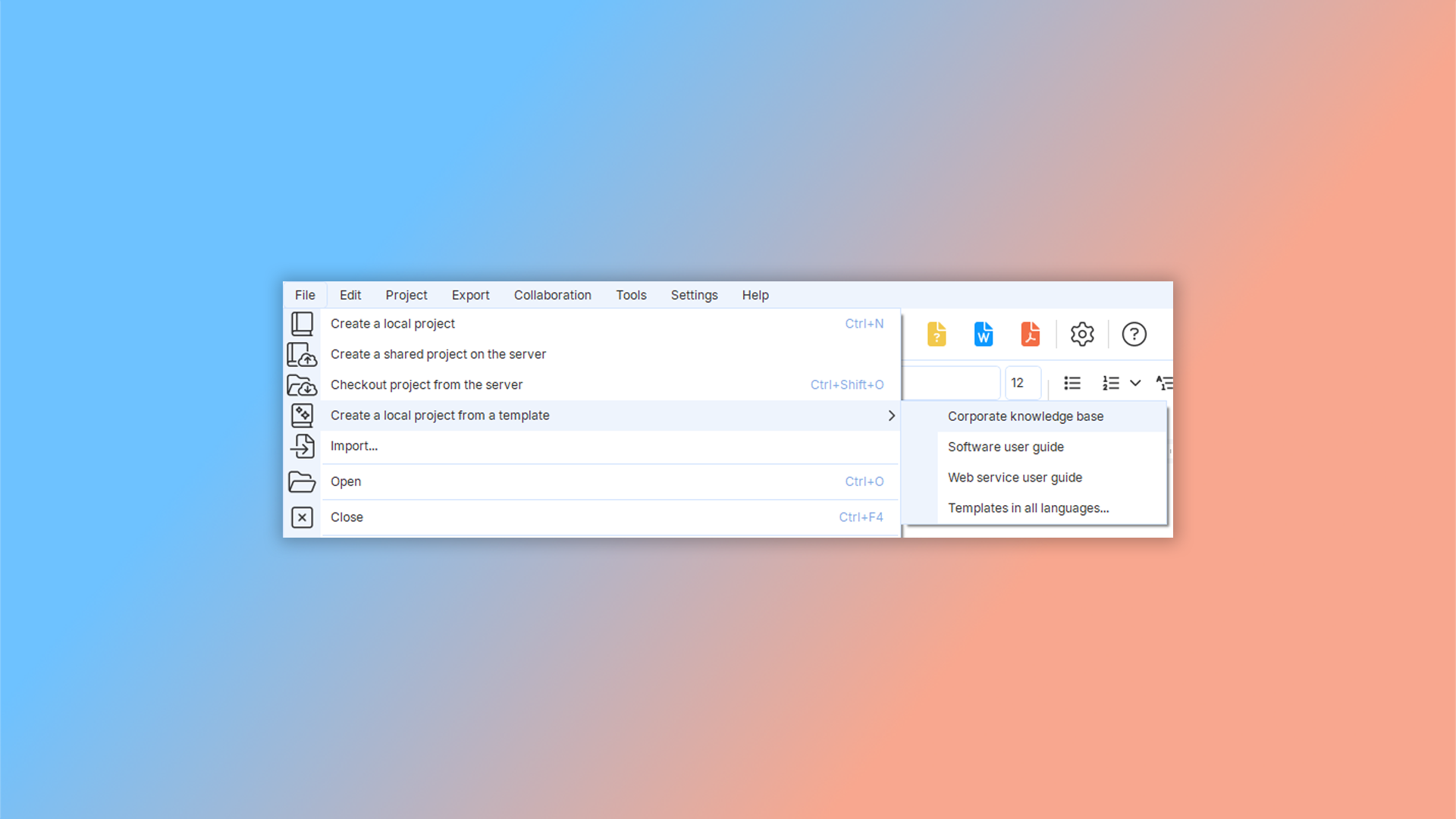 To create a corporate knowledge base from a template, launch the program and navigate to "File" -> "Create a local project from a template" in the main menu. Then, select option "Corporate knowledge base".