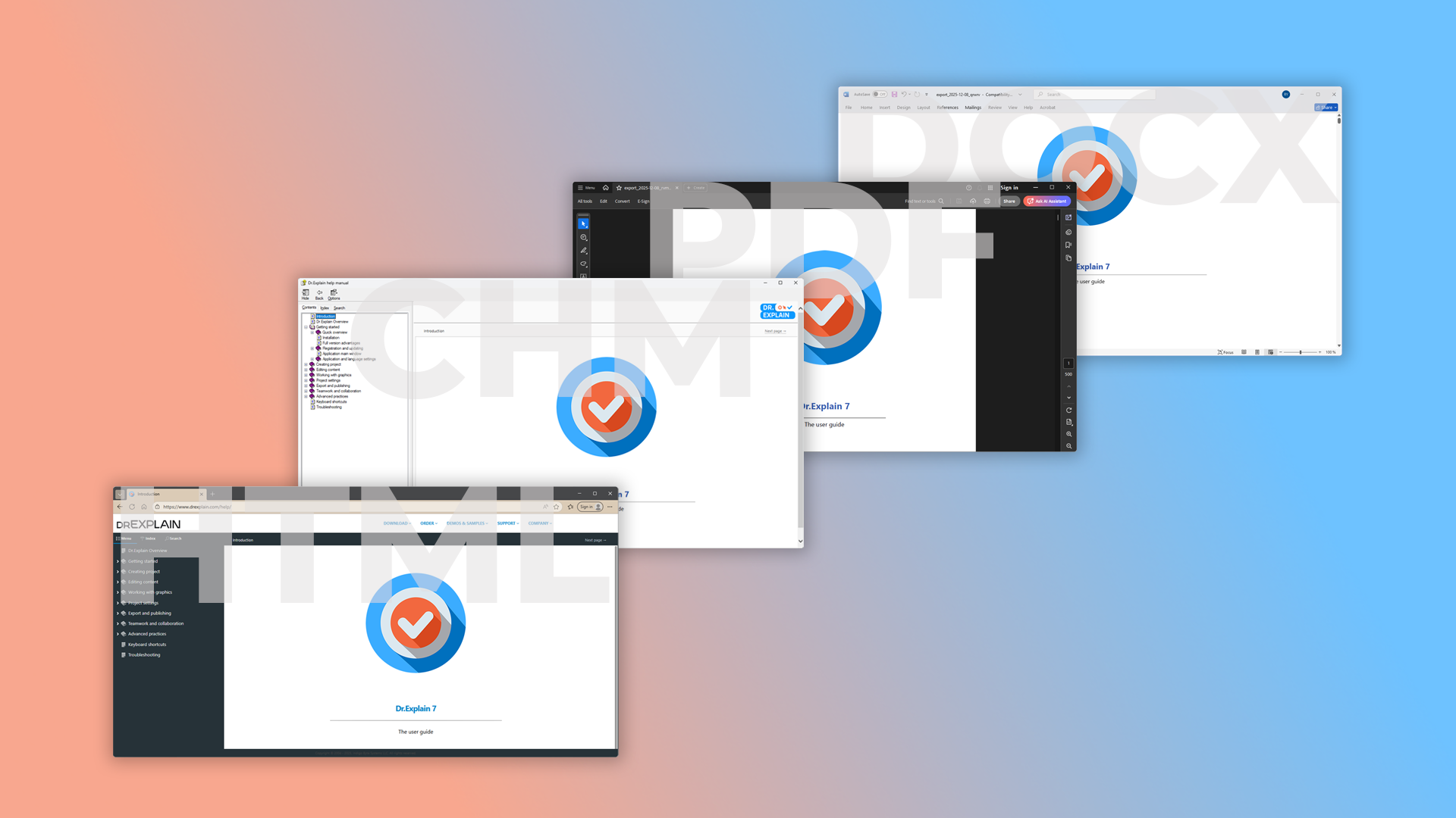 No more maintaining multiple versions of the same guide — one for your application, one for the web and another for printing. With Dr.Explain you can create a multi-format user guide and export it to any format you need.