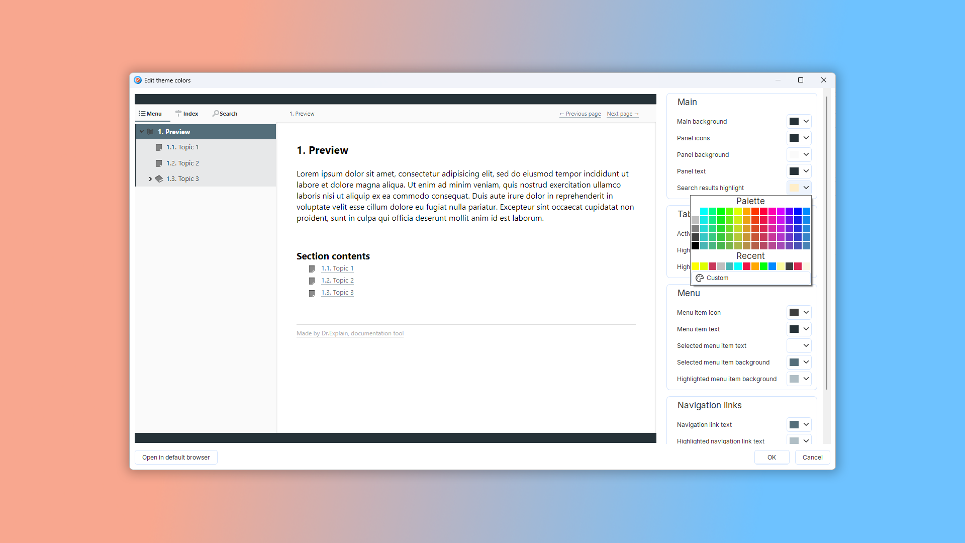 If you've ever changed text or background colors in simple graphics programs like MS Paint, you'll find Dr.Explain's styling tools familiar. You can see all your edits update in real time — no need to export the project just to check how it looks. The screenshots below show examples from real user documentation created with these help authoring tool.