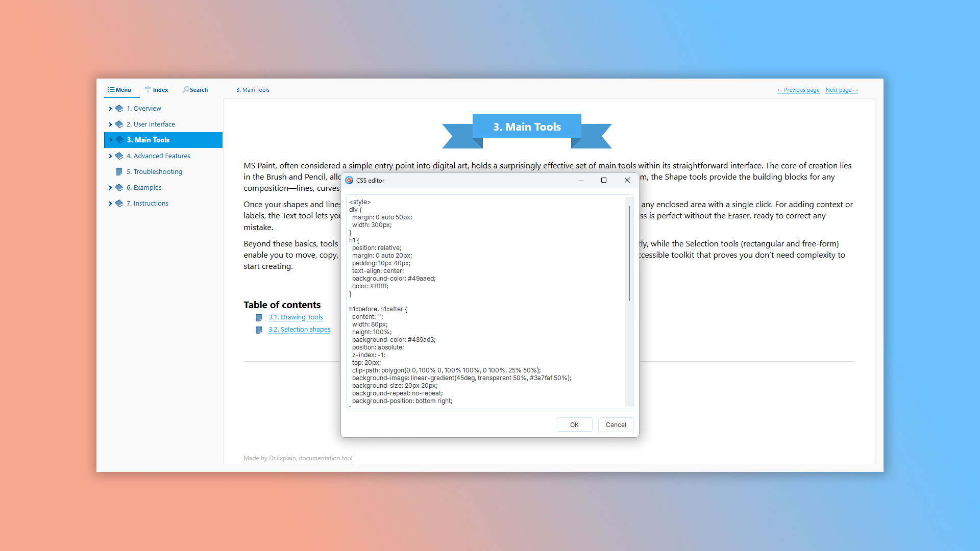 A help system's design directly impacts how users perceive and absorb information. Dr.Explain gives you complete control over your project's appearance — from choosing fonts and adding numbering to working with graphics and adjusting backgrounds. With its powerful text editor and built-in annotation designer, you can bring your creative vision to life without any extra software.