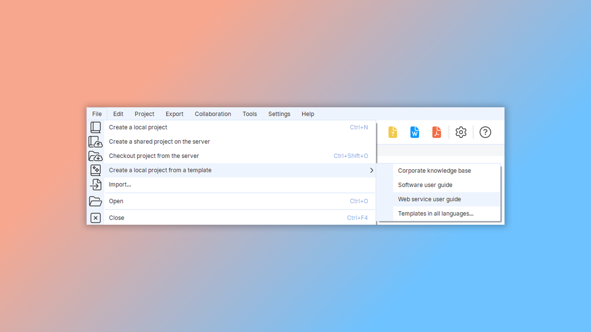 To create a user guide from a template, launch the program and go to "File" -> "Create local project from template" in the main menu. Then, select "Web service user guide".
