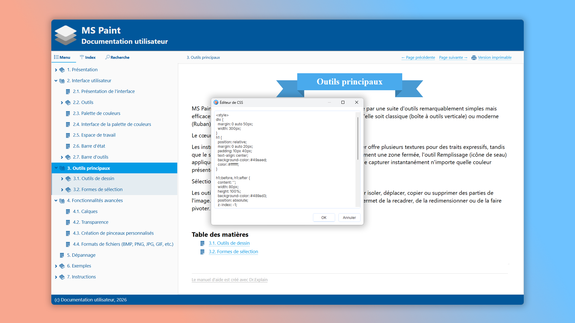 Le design d'un système d'aide influence directement la façon dont les utilisateurs perçoivent et absorbent l'information. Dr.Explain vous donne un contrôle total sur l'apparence de votre projet — du choix des polices et de l'ajout de numérotation au travail avec les graphiques et l'ajustement des arrière-plans. Avec son puissant éditeur de texte et son concepteur d'annotations intégré, vous pouvez donner vie à votre vision créative sans logiciel supplémentaire.