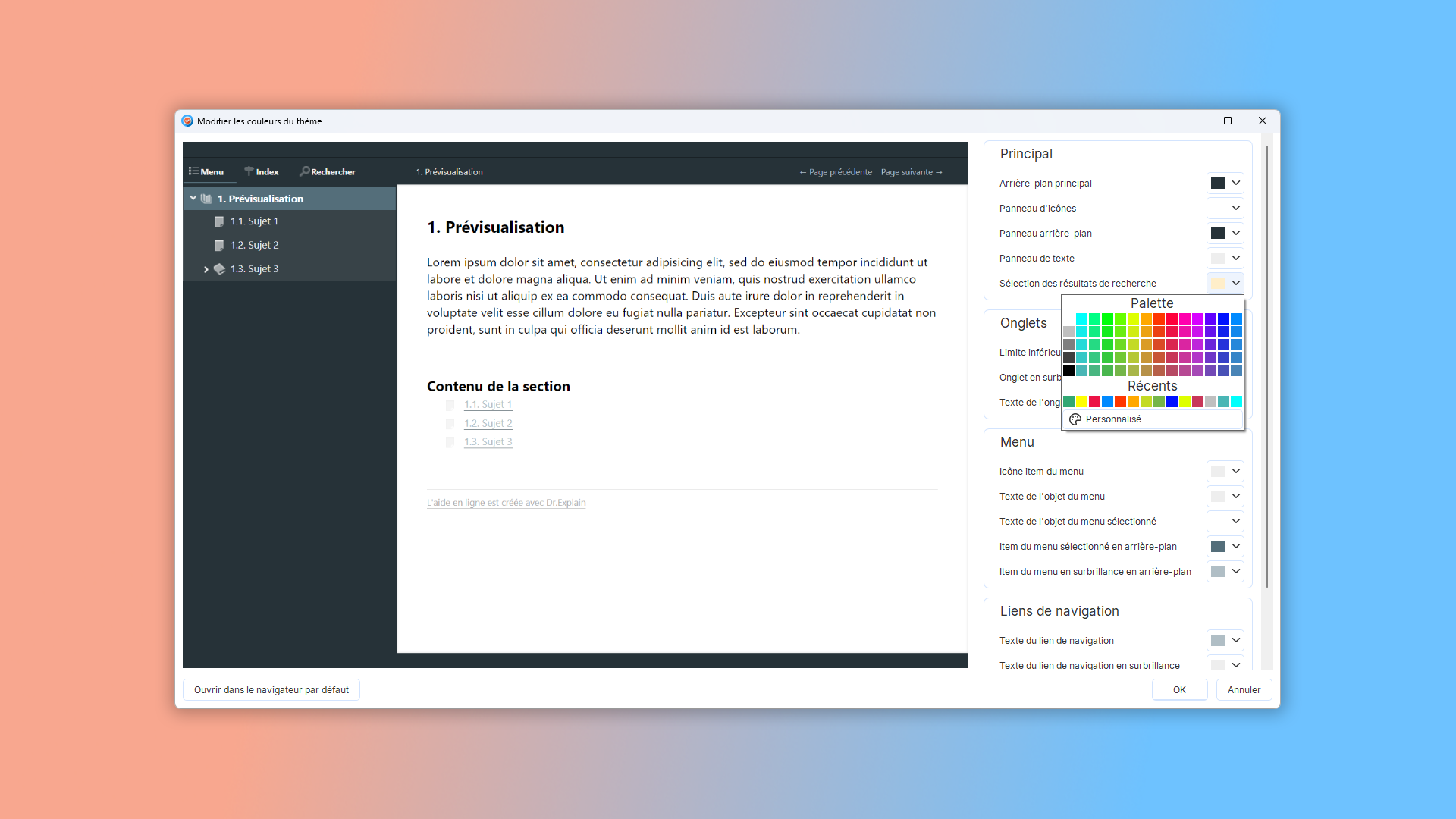 Si vous avez déjà changé la couleur du texte ou de l'arrière-plan dans des programmes graphiques simples comme MS Paint, vous trouverez les outils de style de Dr.Explain familiers. Vous pouvez voir toutes vos modifications se mettre à jour en temps réel — pas besoin d'exporter le projet juste pour vérifier son apparence. Les captures d'écran ci-dessous montrent des exemples de documentation utilisateur réelle créée avec cet outil de création d'aide.