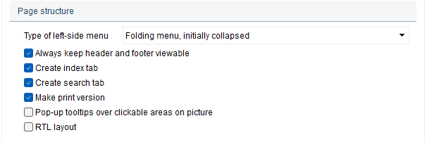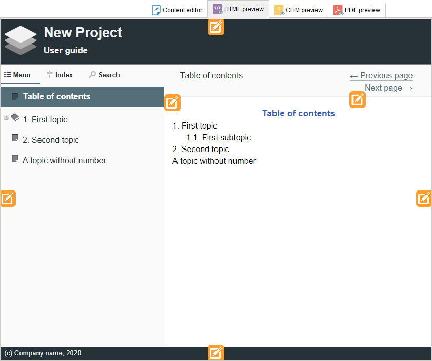 In HTML and CHM preview modes the floating buttons allow to customize the page structure and its elements: header, footer, sidebars, and navigation.