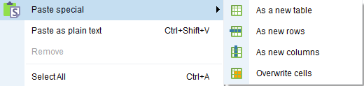 Overwrite cells: the content of the selected cells (or cells below and to the right if no cells in the table are selected) will be replaced with the previously copied content.