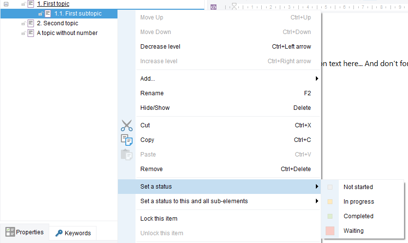 Statuses allow you to mark topics in a topic tree view depending on their completeness level: