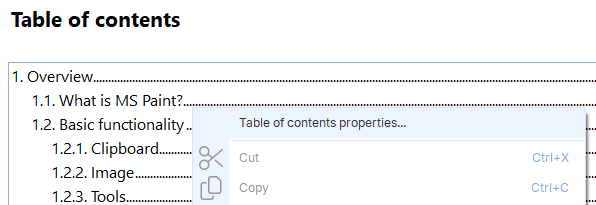 You can customize the appearance of TOC Table of contents properties dialog. Double-click the TOC object or open the dialog from the context menu (Table of contents properties... menu item).