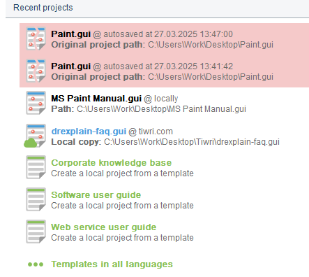 Here you can see the list of recently opened projects. Local projects are displayed in black, shared in blue, project templates in green.