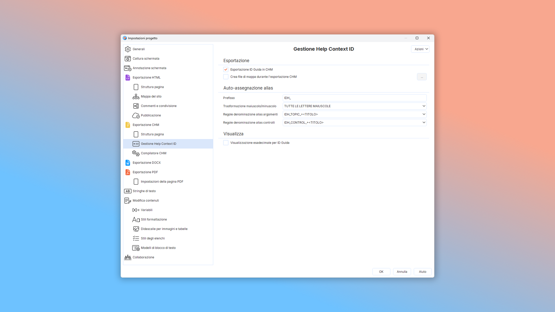Per configurare le impostazioni dell'Help Context ID per l'esportazione CHM nel tuo progetto corrente: