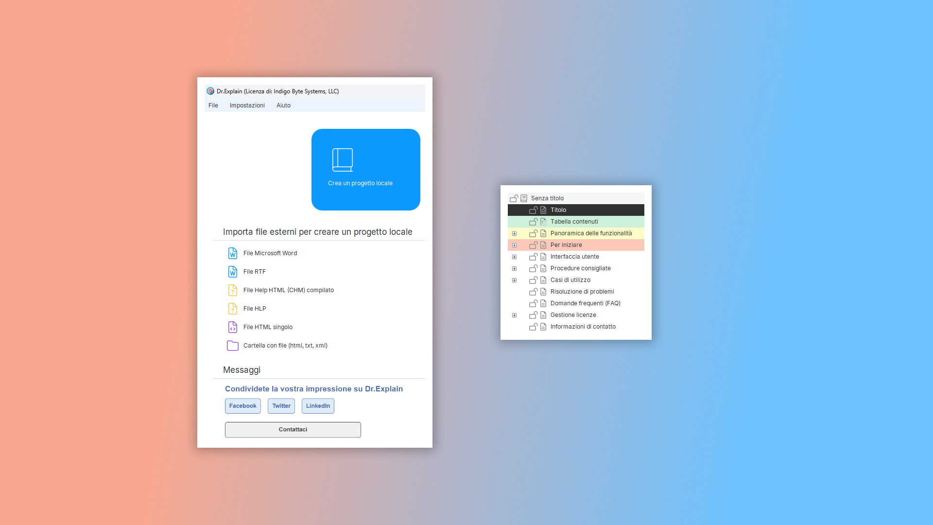 - prevedi di esportare in più formati come CHM, HTML, PDF e DOCX;