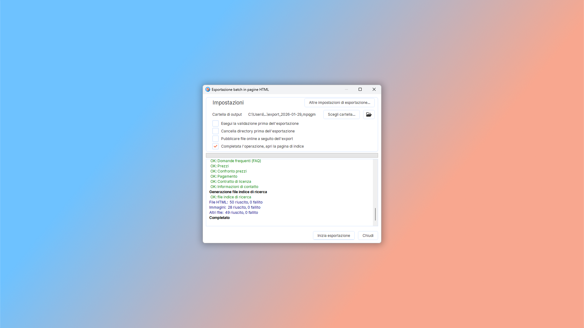 L'HTML è il formato standard per creare pagine web. Quando esporti un manuale utente in HTML, otterrai una guida utente online completa, pronta per la pubblicazione.