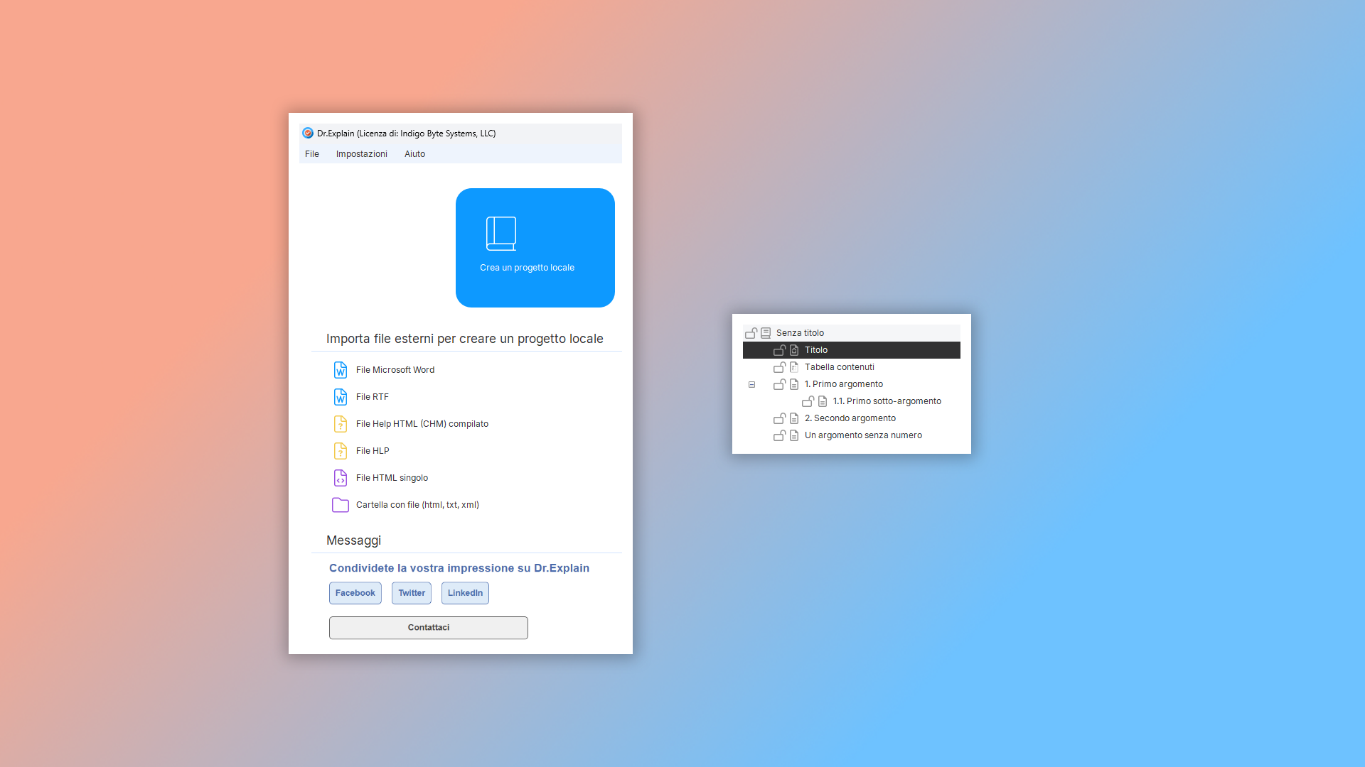 - esportazione multi-formato (HTML, PDF, CHM, DOCX);