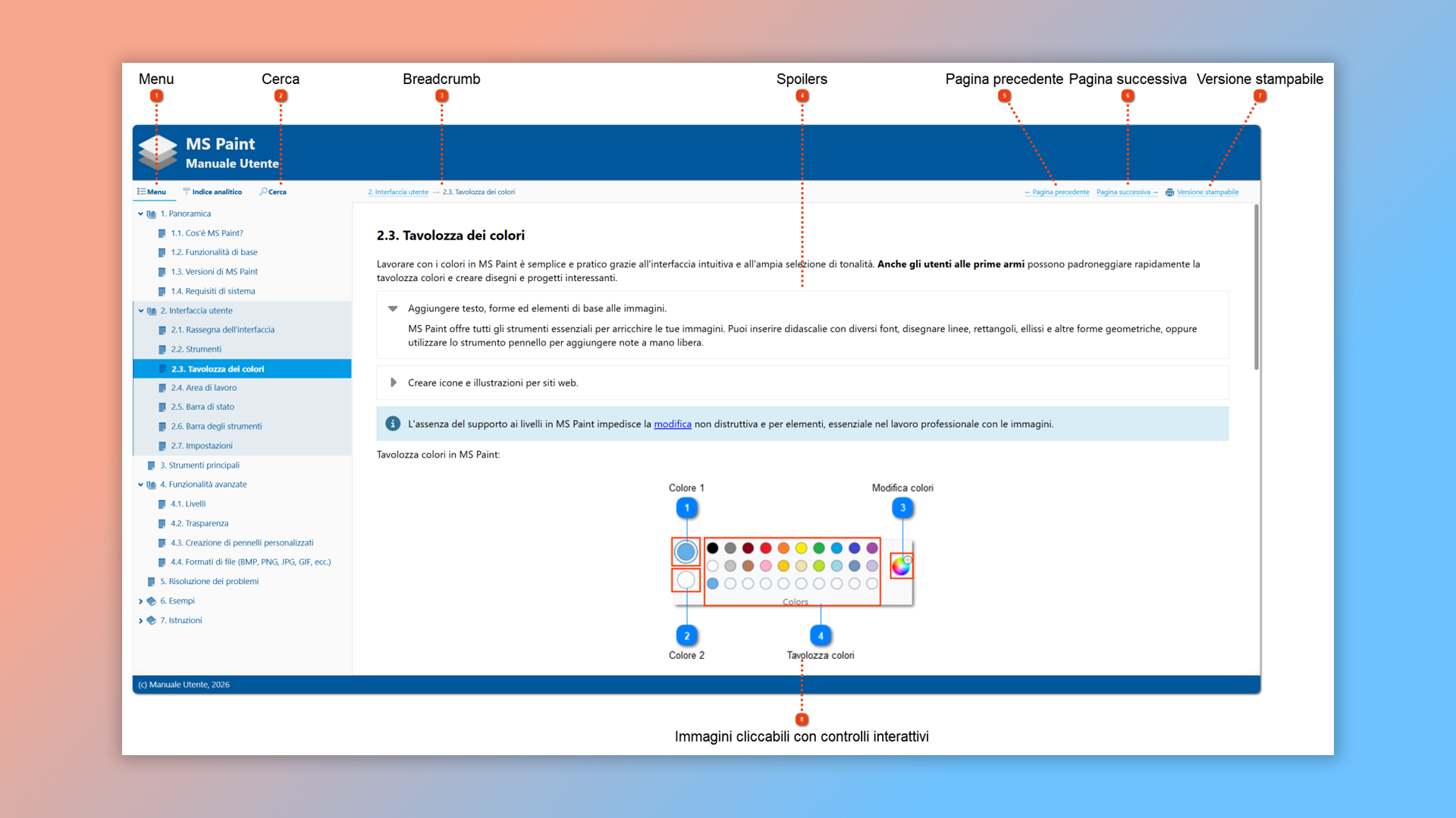 Pensa al tuo manuale online come a un'applicazione web pronta all'uso. Puoi passare da una scheda all'altra, utilizzare la navigazione e cercare tra gli argomenti — tutto senza scrivere una sola riga di codice. Dr.Explain gestisce tutta la programmazione per te, fornendo ogni funzionalità interattiva già pronta.