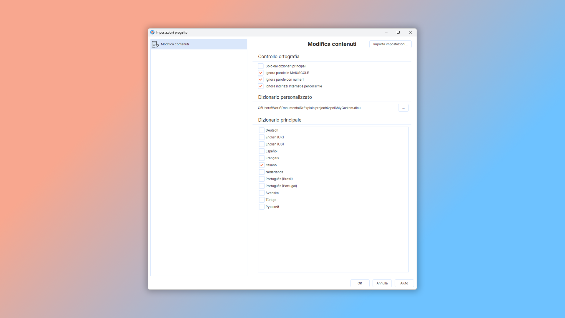 - importando le impostazioni di controllo ortografico da altri progetti Dr.Explain.