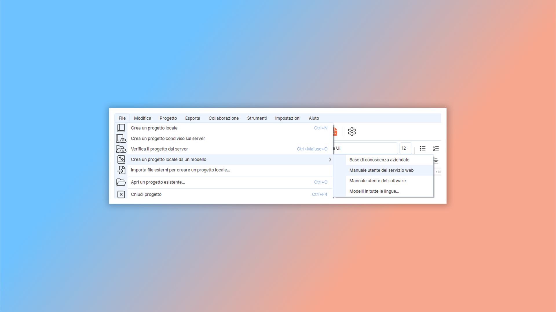 Per creare una guida utente da un modello, avvia il programma e vai su "File" -> "Crea progetto locale da modello" nel menu principale. Quindi, seleziona "Manuale utente del servizio web".