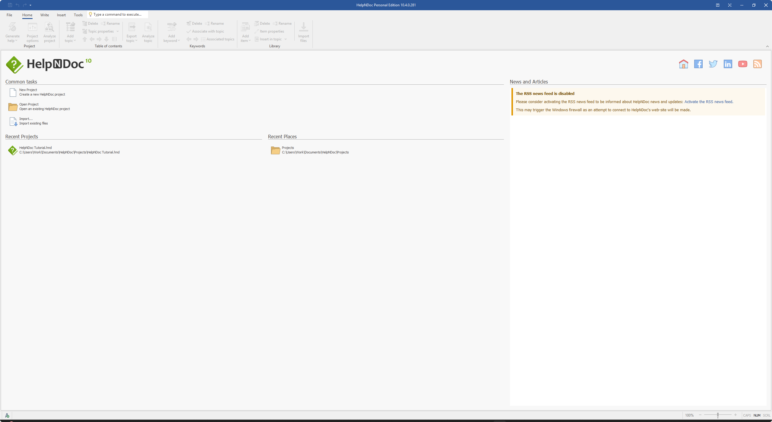 HelpNDoc’s start screen offers flexibility and transparency. By showing "Recent Places" (folders) and news updates, it addresses power users who manage multiple projects, rely on version control, or need to stay updated on new features. This matches the philosophy of freedom, customisation (CSS/HTML), and detailed output control.