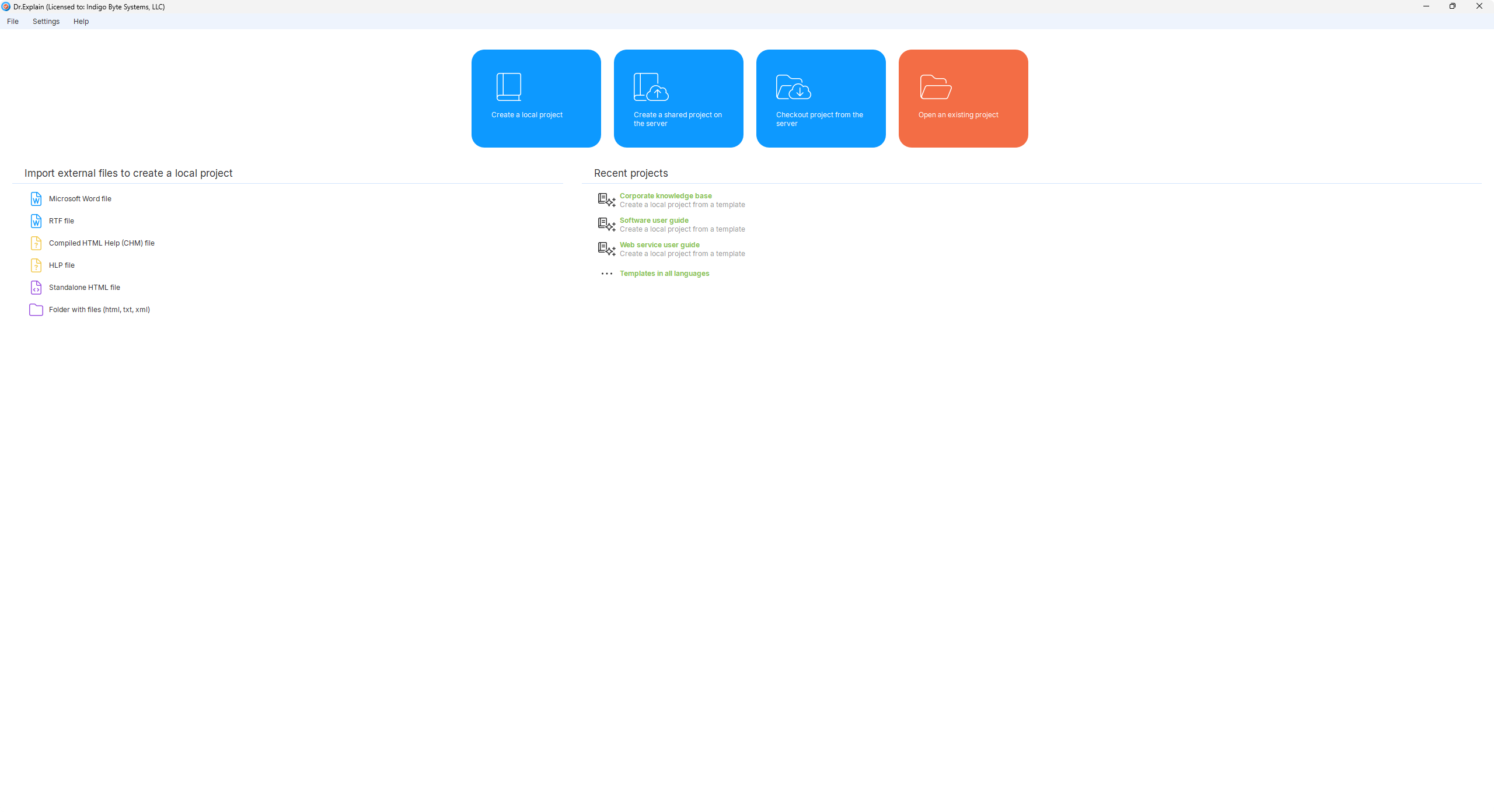 However, their philosophies and workflows differ significantly. HelpNDoc appeals to users who want full control over output. Dr.Explain focuses on speed and automation, especially if your documentation relies heavily on screenshots. Let's have a look at their startup screens.