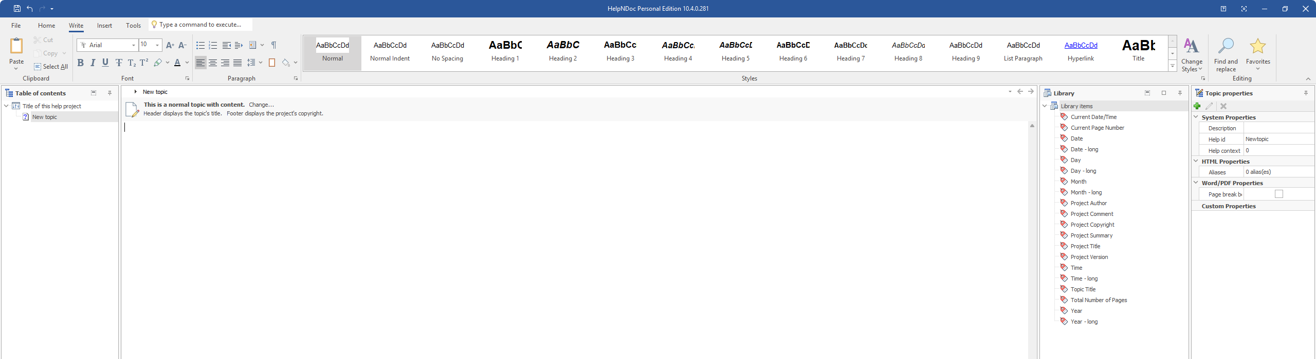 HelpNDoc’s editor showcases its "builder‑centric" DNA. The presence of a Library with dynamic variables, a table of contents panel, and topic lists transforms the editor into a control center. This matches HelpNDoc’s strength: giving writers fine‑grained control over output (CSS, HTML, scripts) and enabling them to maintain consistent metadata across hundreds of topics without manual updates.